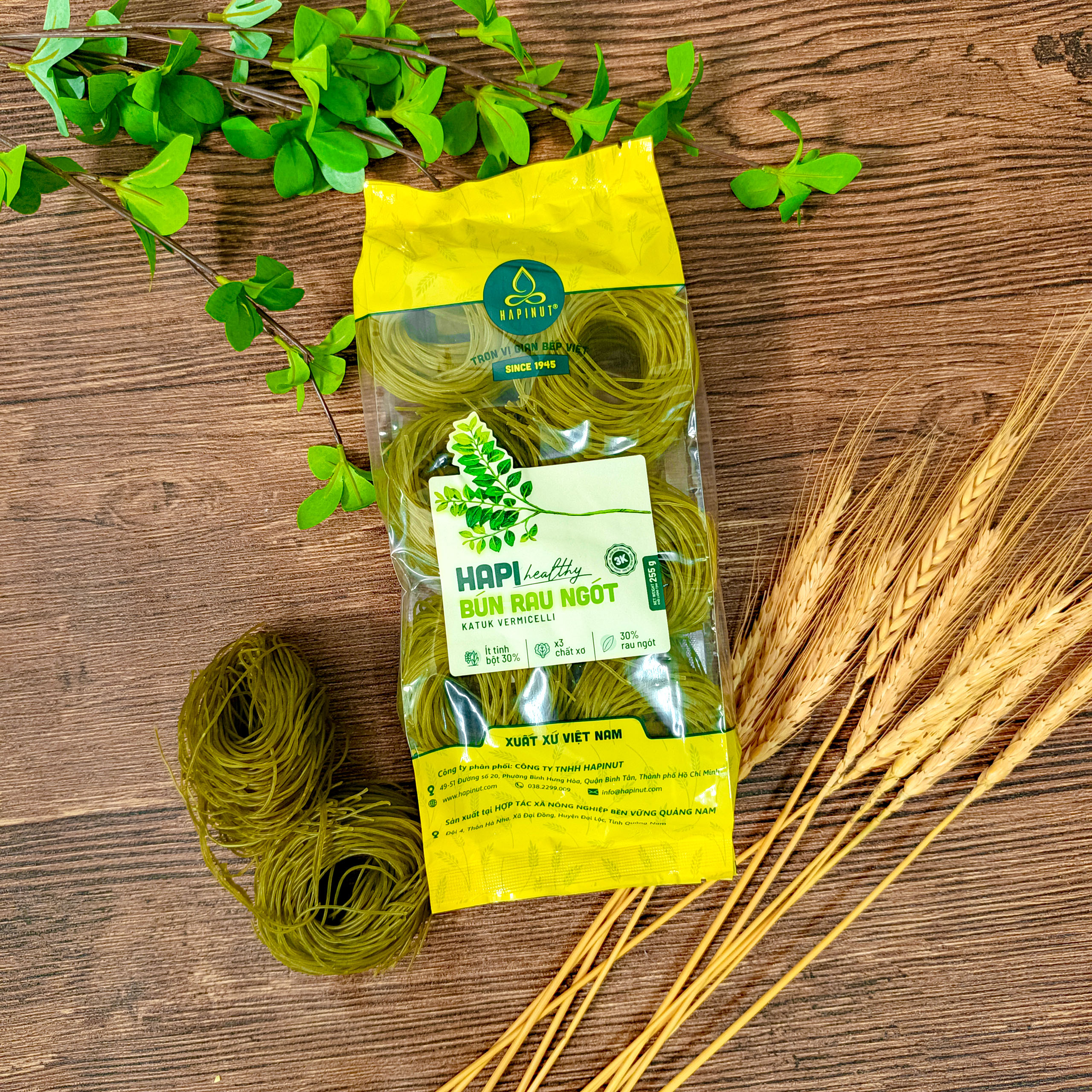 Không chỉ là loại rau quen thuộc trong các bữa cơm gia đình, rau ngót khi được kết hợp cùng bột gạo lại trở thành một loại bún độc đáo và hấp dẫn. Bún rau củ Hapi rau ngót có màu xanh nhạt tự nhiên, thanh thoát và tươi mát. Hương thơm đặc trưng của rau ngót mang đến cảm giác gần gũi, nhẹ bụng và dễ chịu.